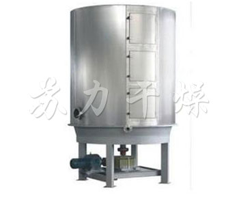 濕物料自加料器連續(xù)地加到干燥器上部第一層干燥盤上,帶有耙葉的耙臂作回轉(zhuǎn)運動使耙臂作回轉(zhuǎn)運動使耙葉連續(xù)地翻抄物料。物料沿指數(shù)螺旋線流過干燥盤表面,在小干燥盤上的物料被移送到外緣,并在外緣落到下方的大干燥盤外緣,在大干盤上物料向里移動并從中間落料口落如下一層小干燥盤中。大小干燥盤上下交替排列,物料得以連續(xù)地流過整個干燥器。中空的干燥盤內(nèi)通入加熱介質(zhì),加熱介質(zhì)形式有飽和蒸汽、熱水和導熱油,加熱介質(zhì)由干燥盤的一端進入,從另一端導出。已干物料從后一層干燥盤落到殼體的底層,后被耙葉移送到出料口排出。濕份從物料中逸出,由設在頂蓋上的排濕口排出,真空型盤式干燥器的濕氣由設在頂蓋上的真空泵口排出。從底層排出的干物料可直接包裝。通過配加翅片加熱器、溶劑回收冷凝器、袋式除塵器、干料返混機構(gòu)、引風機等輔機,可提高其干燥的生產(chǎn)能力,干燥膏糊狀和熱敏性物 料,可方便地回收溶劑,并能進行熱解和反應操作。